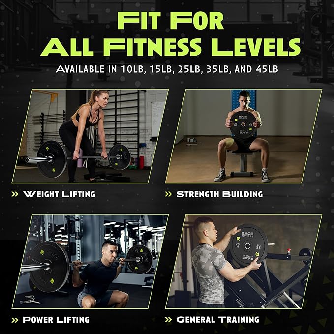 - VERSATILE USE: Whether you are a beginner, a seasoned athlete, or a fitness enthusiast, Rage Bumpers are tailored to meet the needs of all fitness levels. These weight plates are designed to be used with Olympic barbells to provide peak performance.
