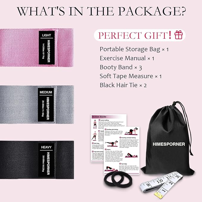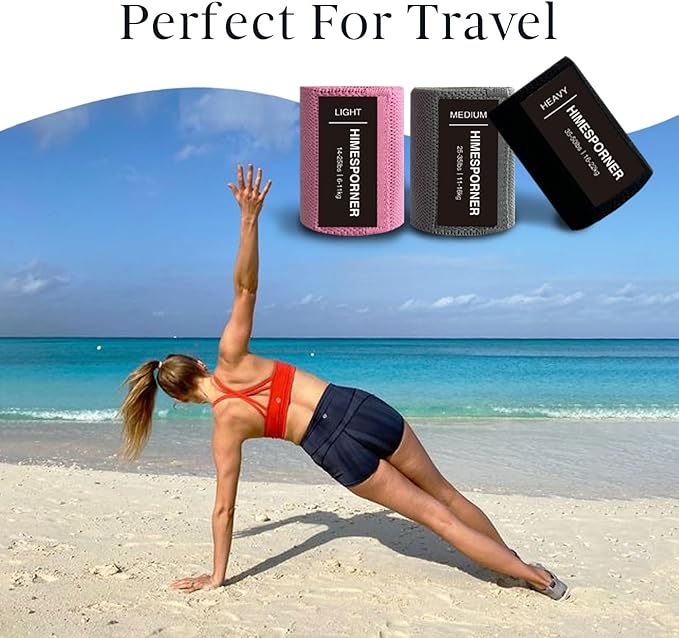 - 【What You Get】: 3 fabric resistance bands of different colors and resistance, 2 hair ties for tying hair, Soft tape measure for measuring body measurements, portable travel carry bag and instruction guide.