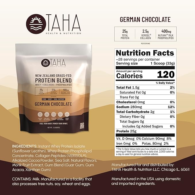 Taha Health & Nutrition Mind + Body Protein Blend ??German Chocolate | 25g Protein from Whey & Collagen + 400mg Milk Phospholipids | Grass-Fed, Free-Range New Zealand Dairy | 2LB