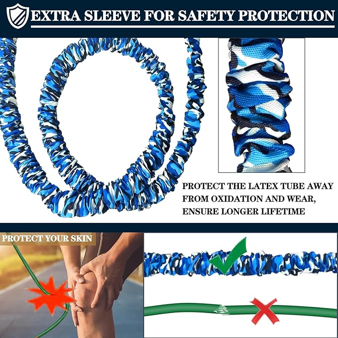 - 2.Resistance Bands With Handles And Protective Sleeves:5 x camouflage navy blue resistance bands(40lbs,50lbs,60lbs,70lbs,80lbs), 1 x smooth foam door anchor,2 x ankle straps, 2 x Anti slip rubber handles, 1 x Workout Guide, 1 x carrying Bag. Our resistance bands set can be selectively combined and used according to your physical condition. The tension pound value can be adjusted from 40Lbs to 300Lbs. For detailed combination methods, please refer to page A+.