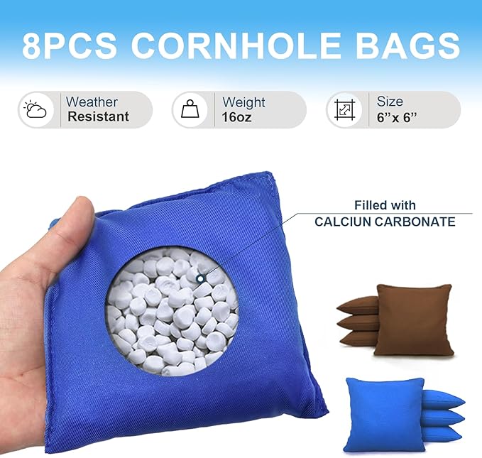 - ☑️【Classic Cornhole Game Set】The cornhole set includes 2 foldable 2’x3’ MDF portable cornhole boards , (8) 16oz all-weather bean bags. Each corn hole board is designed with foldable feet, secured by galvanised bolts, making it lighter and more portable than other cornhole boards on the market, ready to use out of the box, and with a support bar to prevent bouncing.