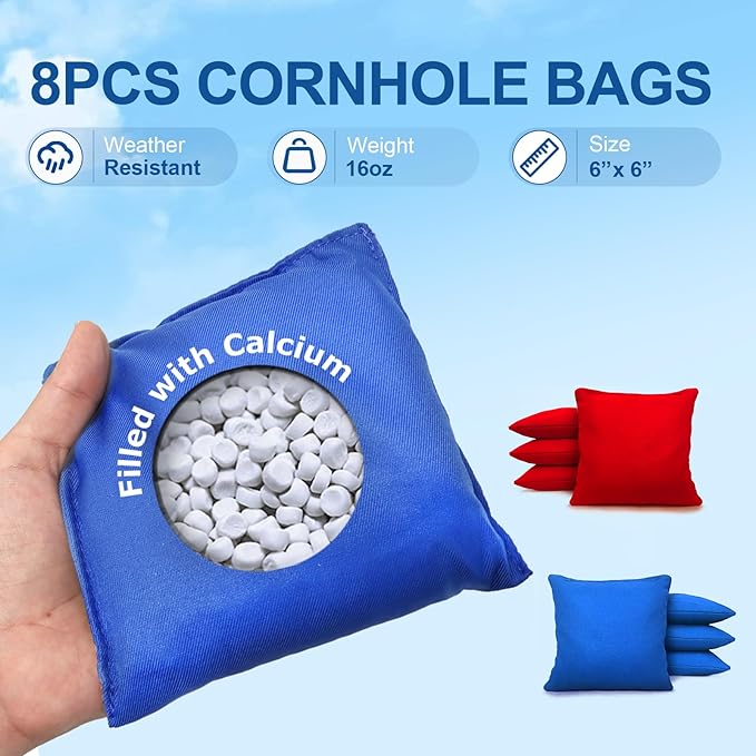 - 🗽【 All Weather Cornhole Game Set 】 Full cornhole set includes 2 regulation size (3x2)feet cornhole boards for authentic gameplay, 8 all-weather bean bags for cornhole,We also have an extra zippered tote bag you can put your cornhole set in to avoid getting dirty, durable double needle canvas corn hole beans bags includes 4 red and 4 blue, standard 6 x 6 inches, perfect for gaming .