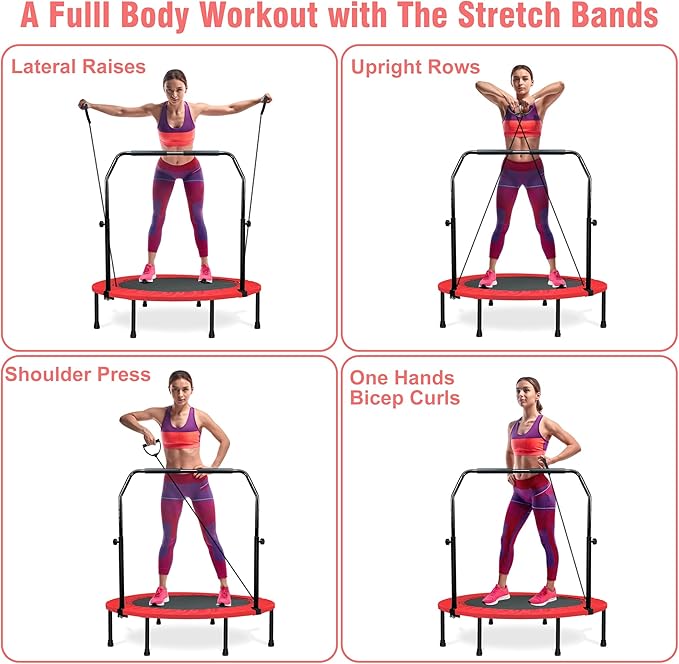- Integrated Stretch Bands - Our exercise trampoline comes equipped with tension ropes that require users to coordinate their bodies by grasping and controlling the bands. This feature enables you to adapt to different speeds, forces, and directions of movement, facilitating upper limb, core, and lower limb strength training. Embrace the added challenge and achieve a more effective workout