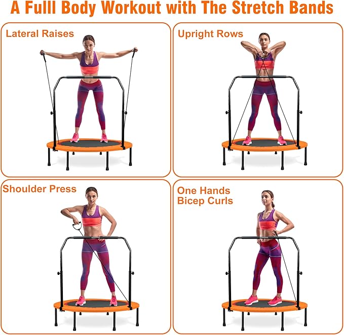 - 5-Level Adjustable Handlebar for Comfort & Safety - This fitness trampoline for adults features an adjustable handlebar with 5 height, ranging from 37 to 46 inches, to accommodate users of different heights. The adjustable handlebar not only enhances comfort but also improves stability and safety during exercises, making your workout more effective and secure