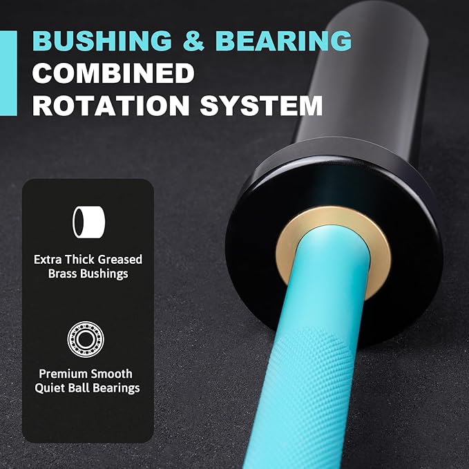 - An Eye-Catching Barbell with Reliable Performance: Crafted from high-grade alloy steel, this 4ft bar is built to withstand the rigors of intense training sessions, ensuring a long-lasting and reliable performance. The sleeves feature a unique black E-coat finish and the shaft is finished with ceramic coating in unique turquoise color, combining corrosion and oxidation resistance with a stylish and elegant appearance.