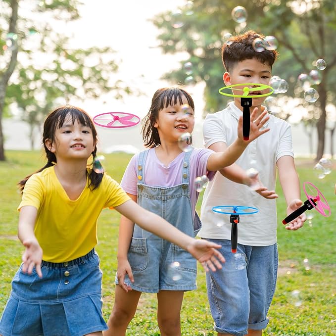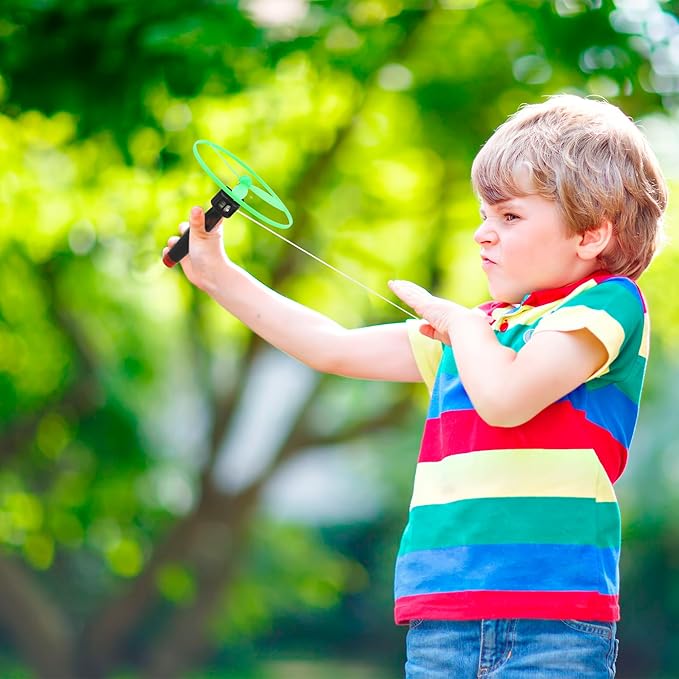 - 【Simple and Interesting Game Play】: Just put the flying toy on the top of the handle. There is a red pull wire on the handle. Pull the wire to the right position and it can fly very high, easy to operate.