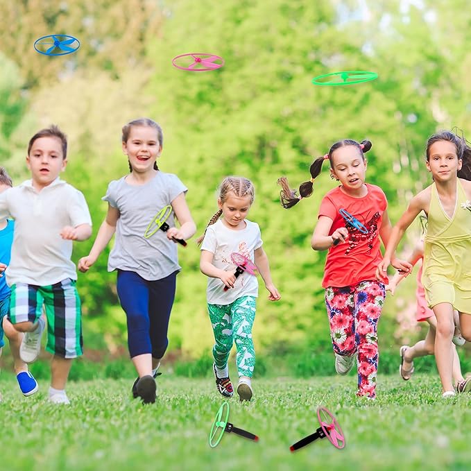 48 Pcs Flying Saucer Flying Disc Toy Helicopter Toy Disco Flyers Include 16 String Launchers and 32 Flying Saucer for Kids Outdoor Games Birthday Favors, Random Colors