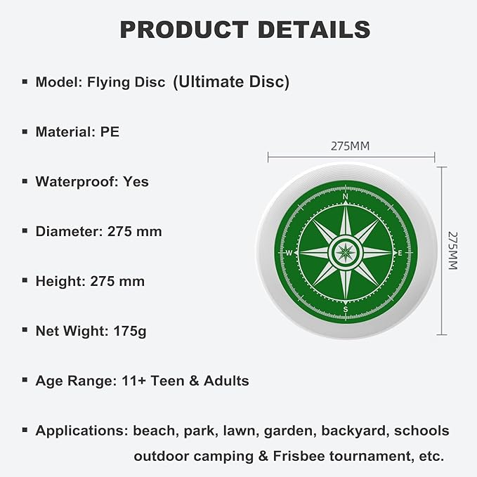 - 1.Beginners or Experienced Players: Ultimate Disc, Standard weight 175g; 10.65 Inch / 27cm diameter; Suitable for teenagers and adults