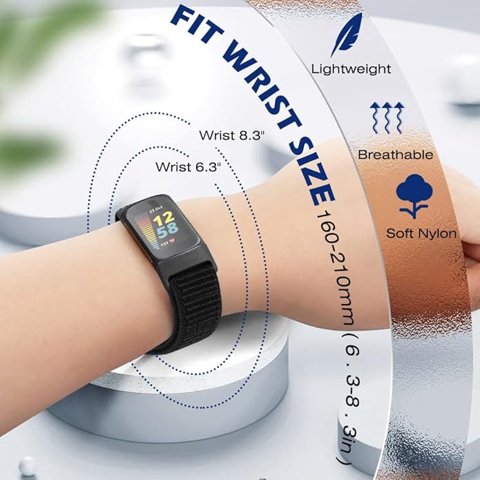 • NO BUCKLE DESIGN -- Fits 6.3"-8.3" (160mm-210mm) wrist, the adjustable strong velcro helps you no need to struggle with racking buckles in order to secure your watch band anymore. No buckle needed, just easily stick and lock your Fitbit Charge 6.