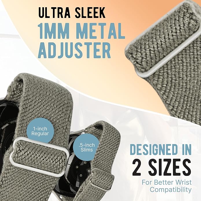 • TAILORED WRIST FIT - There will never be another dull outfit in your wardrobe with our sensational cotton watch band collection. Our elastic bands are adjustable and feature 2 main sizes for better wrist compatibility (14mm Slims, 25mm Regular).