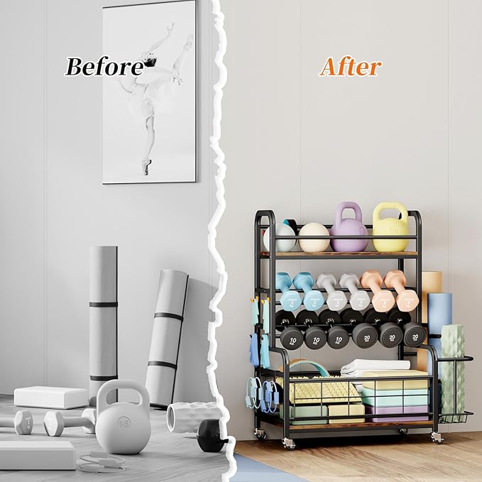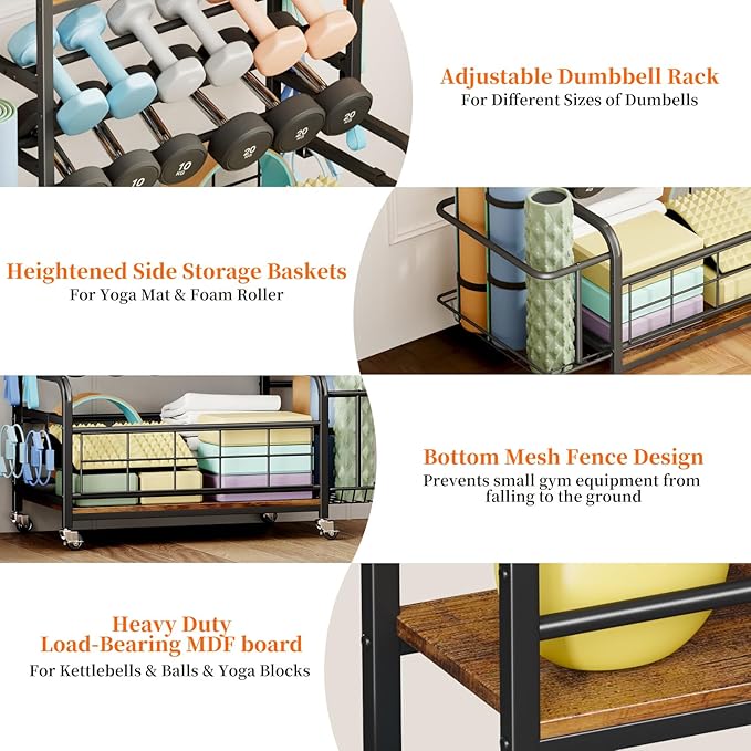 - ALL-IN-ONE HOME GYM STORAGE RACK: This weight storage racks is equipped with top plank layer for storing kettlebells, 2-layer dumbbell rack,a side basket for storing yoga mat and foam rollers, 6 side hooks for fitness resistance band,bottom storage rack is perfect for storing balls, yoga blocks and other exercise equipment.Perfect for organizing your various gym equipment into one storage rack, easy to save your space and stay organized