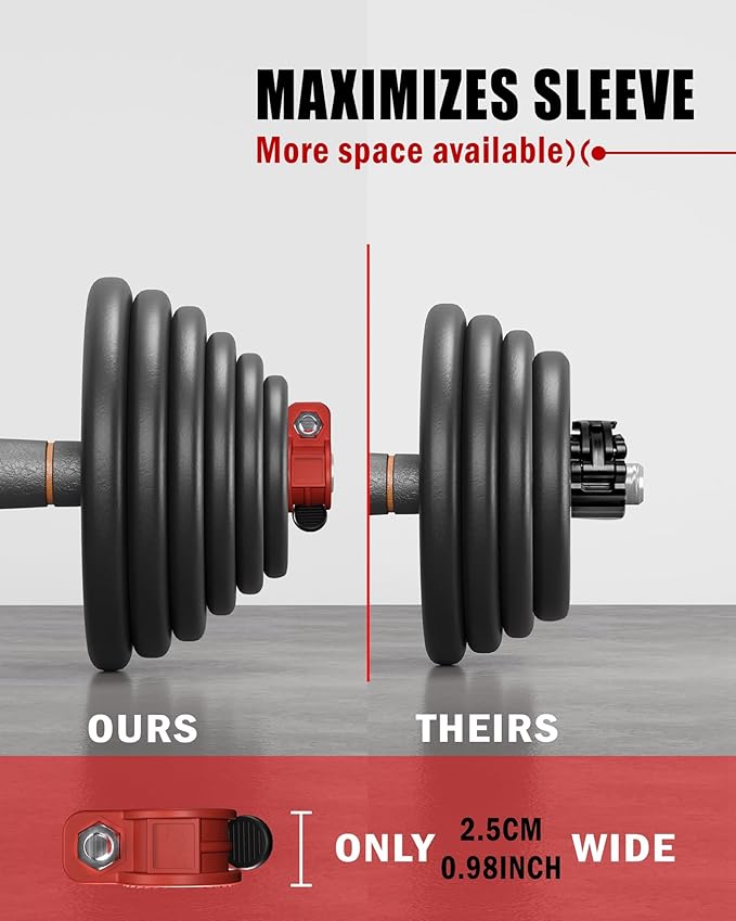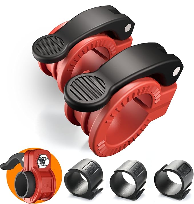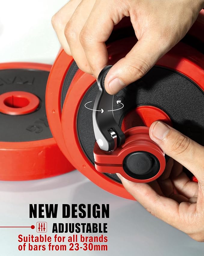 • Wide Size Adjustment Range:Adjustable barbell clamps fit 0.9-1.18inch bars with precise millimeter control. Self-tightening mechanism ensures secure grip that won't loosen over time during workouts.