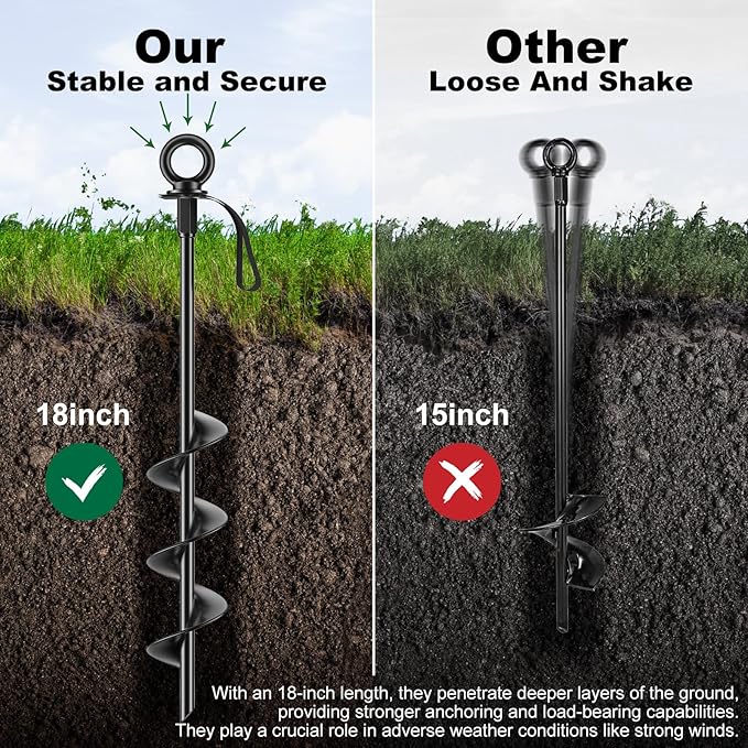 - Dimesion And Package: Includes 4 x 18 inch Ground Anchors, 4 x 13 inch Straps, 1 x T-wrench and 1 x Drill Adapter, 4 x Gasket, 4 xRubber Rdge Guards .Whether manual installation with a T-type wrench or a drill machine/impact wrench, easy to install, also easy to removal and can be reused for a long time.