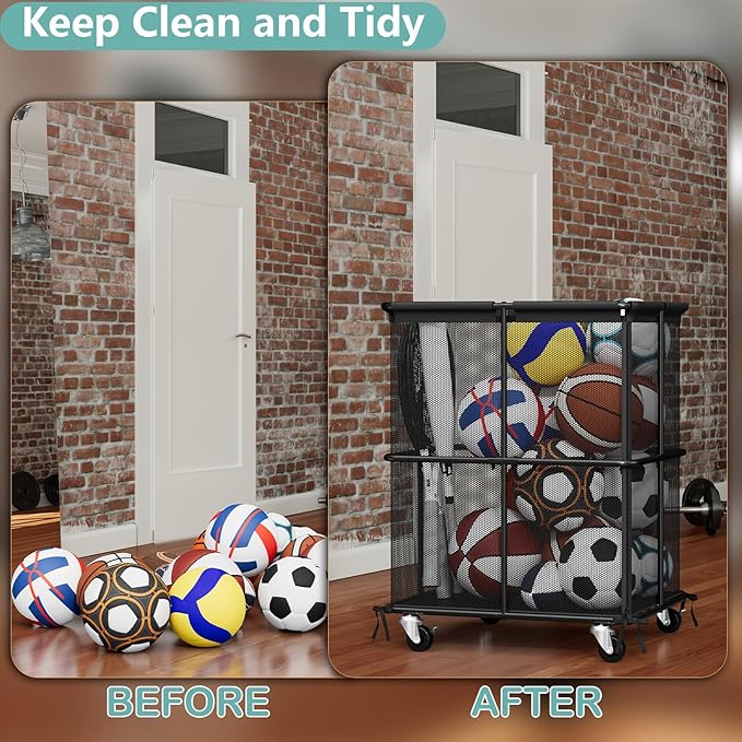 - Large Capacity: This ball storage bin measures 16.5'' x 23.6'' x 30.7'' and weighs 7.4 LBS, storing basketballs, volleyballs, soccer, some small sports balls, sports bats, and golf clubs, so it is enough to use daily.