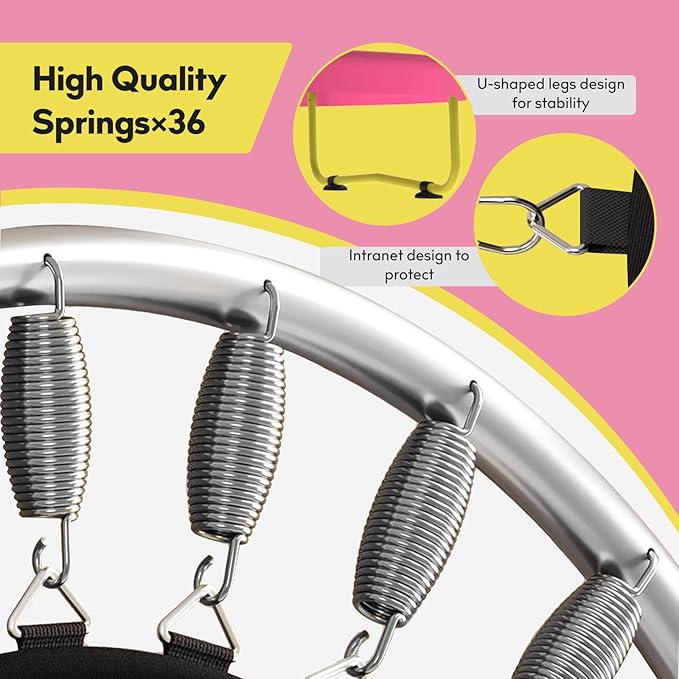 - 【FUN TO USE】The Kids Trampoline has 36 fully stretched springs so kids can experience the fun of bouncing as they play. Jumping is a great way for kids to release their energy and develop gross motor skills for fun as well as exercise. Keep your kids from getting addicted to video games, this trampoline is the perfect choice,can be installed indoors, outdoors, garden or backyard. Really a creative trampoline toys for toddler indoor/outdoor.