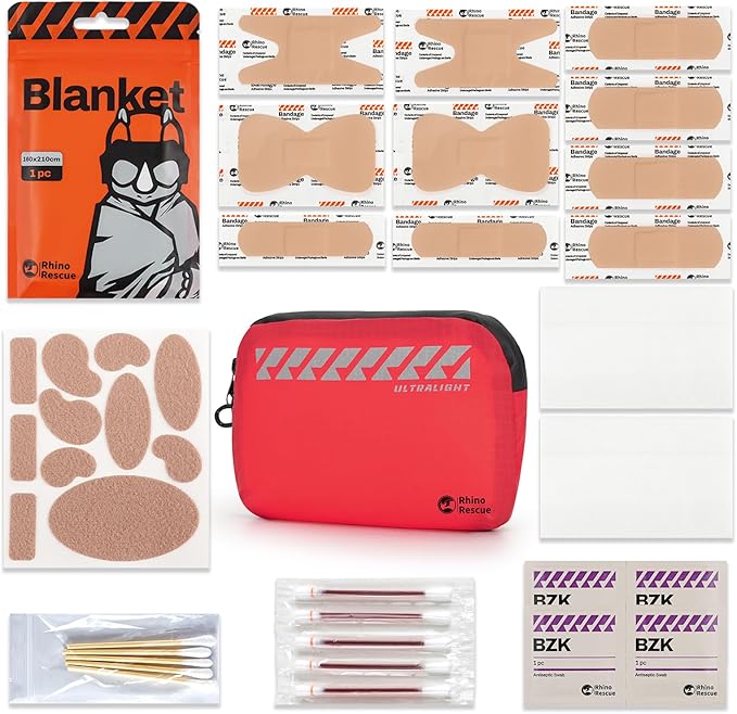 - [Simplify supplies but keep effects] The RHINO RESCUE First Aid Kit has been researched and analyzed in the marketplace to remove many of the accessories that cannot be used in actual injury scenarios. This mini med kit retains 18 accessories with the highest frequency of outdoor use, such as: moleskin for feet, emergency blanket, iodine swabs, BZK Antiseptic Pad and so on. Under the premise of ensuring safety, the weight of outdoor activities is minimized