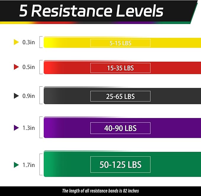 - 5 Resistance Levels(5-125pounds): Five colors are included in our resistance band set. Different colors represent different levels of resistance. Yellow Band 8-15 lbs, Red Band 15-35 lbs, Black Band 25-65 lbs, Purple Band 40-90 lbs, Green Band 50-125 lbs. Each elastic bands for exercise represents a different strength level and is suitable for beginners, fitness enthusiasts, men and women