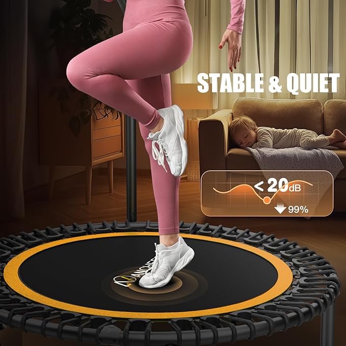 - Quiet 45dB Bungee Technology: our bungee system is lab-tested to be 43% quieter than loud spring trampolines (45dB vs 80dB). That's softer than normal conversation! Perfect for apartment workouts anytime - even at night. Meets all residential noise rules