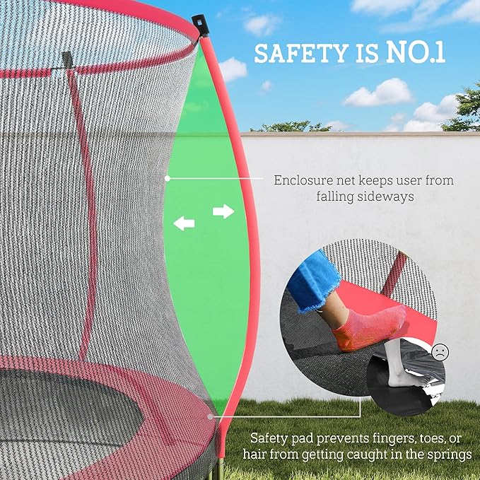 - Enhanced Safety Features: This outdoor trampoline with net is designed with safe padding, innovative curved poles, and an enclosure net to minimize injuries during play