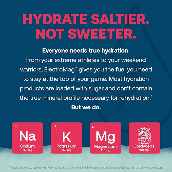 - TRUE DIFFERENCE - ElectroMag is crafted with intention using carefully sourced ingredients. Contains 750 mg sodium, 1390 mg chloride, 250 mg potassium & 100 mg magnesium for essential minerals; 100 mg fruiting body cordyceps mushroom for endurance.