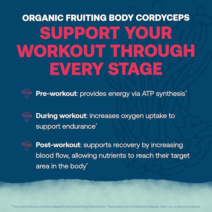 - KEY INGREDIENTS - Organic fruiting body cordyceps mushroom have been used for energy production, oxygen utilization, and muscle recovery. Studies show Cordyceps may improve the way the body uses oxygen, especially during exercise.