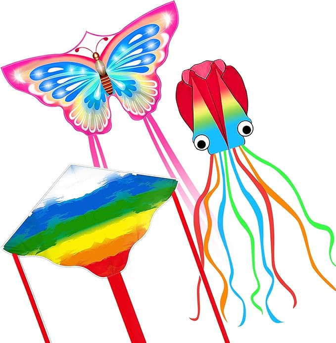 - Varied Kite Set: This set includes 3 different types of kites, featuring rainbow delta and butterfly kites, as well as the beloved rainbow octopus kite by children. Each kite comes with a durable reel equipped with 100 meters of kite line. This set caters to the preferences of most people, offering supreme value for money. It’s a one-time purchase for a family’s joy