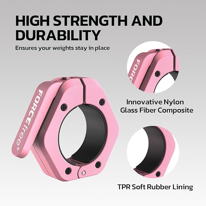 • ๐‡๐ข๐ ๐ก ๐’๐ญ๐ซ๐ž๐ง๐ ๐ญ๐ก & ๐ƒ๐ฎ๐ซ๐š๐›๐ข๐ฅ๐ข๐ญ๐ฒ: Forcefree+ Barbell Clamps made of high quality innovative nylon and glass fiber composite, outperforming traditional ABS collars. This advanced material withstands heavy loads and ensures long-lasting stability and safety for your toughest workouts. Weight collars long-lasting and durable, very suitable for weightlifting, high lift, Olympic weightlifting, bench press and other strength training.