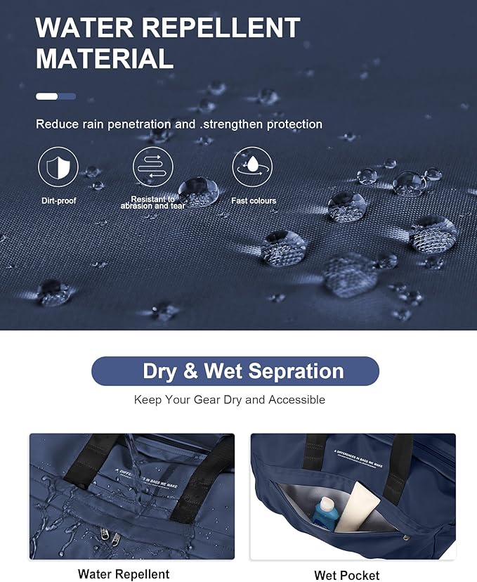 - 【Waterproof & Wet Pocket】Crafted from high-density waterproof material, the gym duffle bag keeps contents dry. It features a separate compartment for wet items like clothes or towels.