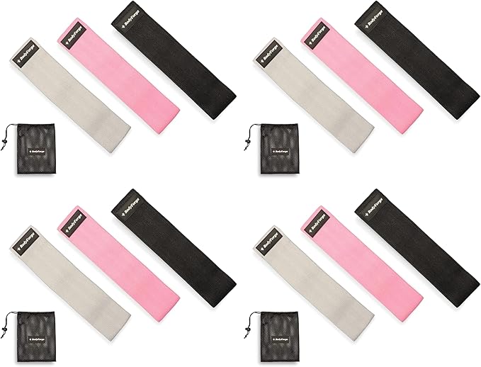 - PREMIUM EXERCISE BANDS: BodyForge Fabric Hip resistance bands come in 3 varying resistance levels (Light 14-25lbs, Medium 25lbs -35lbs, Heavy 40lbs-50lbs). Made with a soft cotton material, these wide bands offer comfort while preventing pinching and snapping. The built in latex grip prevent the band from slipping or rolling while exercising. The 14″ by 3″ bands offer a great variety of exercise options whether you are just beginning your workout journey or been working out for years.