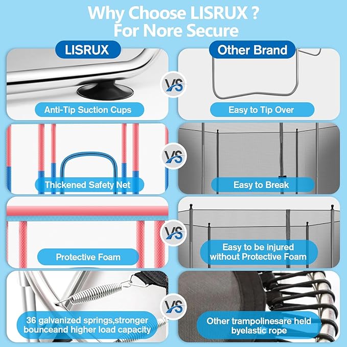 - 【 Easy to Assemble 】Trampoline indoor kids instructions for individual packaging and installation video. Accessories including one trampoline for kids, safety net, springs cover pad, jump pad, rust-proof steel pipe, pull tool (T-Hook), trampoline basketball hoop, 6 pcs large suction cups, 12 pcs pit ball, trampoline accessories and all the installation tools you need, which can provide more fun for your children while jumping.