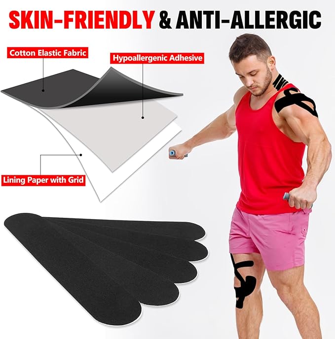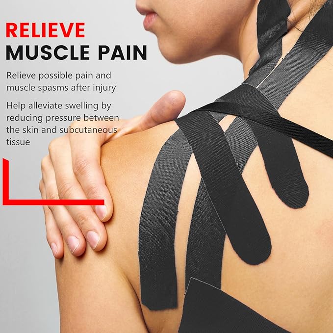 - 【Skin friendly】Our athletic tapes are latex-free formula minimizes discomfort for sensitive skin. You can use these muscle tapes on your neck, shoulders, waist, legs, and ankles to support muscle movement during activity