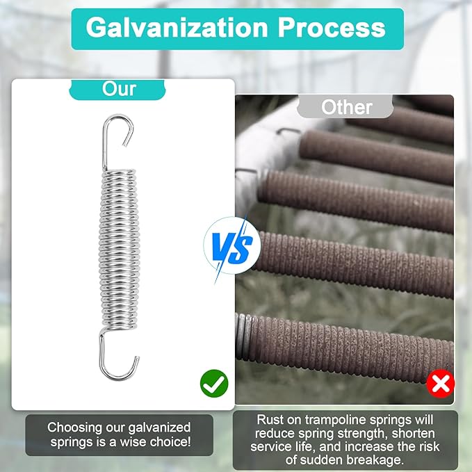 - Premium Galvanized Steel Material: Made from durable galvanized steel, these replacement trampoline parts are rust-resistant, ensuring long-lasting strength and stability. These springs are designed to handle outdoor conditions and maintain their performance over time.