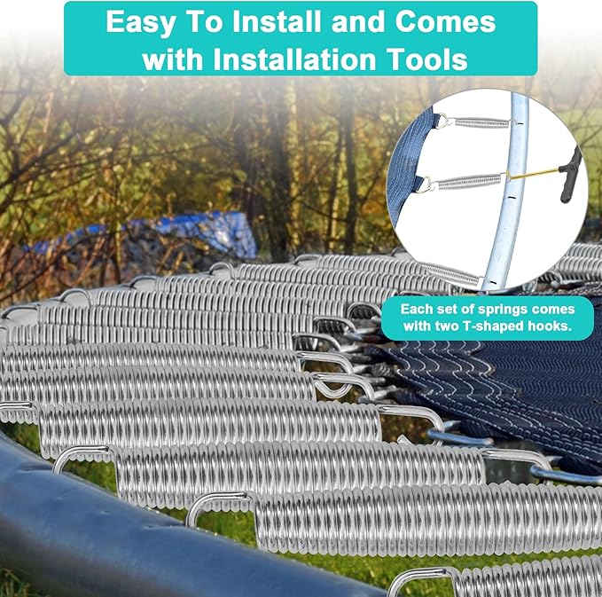 - Complimentary T-Hook Tool for Easy Installation: The set comes with 2 trampoline spring tools (T-hooks) that make the installation and replacement of your trampoline springs easier and faster. These tools reduce your effort, providing a hassle-free experience when assembling or maintaining your trampoline.