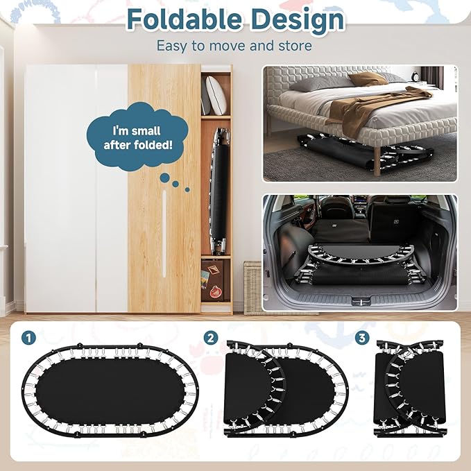 - Foldable Indoor Trampoline: The mini trampoline, measuring 56''L x 36''W x 50''H, is designed for indoor use. Its foldable feature allows it to take up little space when not in use, making it easy to store. It's an ideal choice for kids' daily entertainment, offering both fun and convenience.