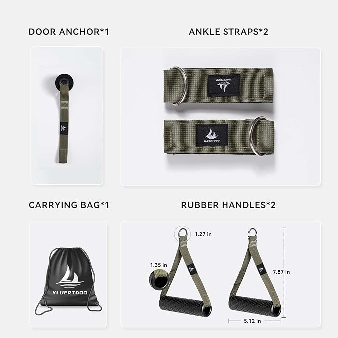 - 2.Resistance Bands With Handles And Protective Sleeves:5 x camouflage navy blue resistance bands(40lbs,50lbs,60lbs,70lbs,80lbs), 1 x smooth foam door anchor,2 x ankle straps, 2 x Anti slip rubber handles, 1 x Workout Guide, 1 x carrying Bag. Our resistance bands set can be selectively combined and used according to your physical condition. The tension pound value can be adjusted from 40Lbs to 300Lbs. For detailed combination methods, please refer to page A+.