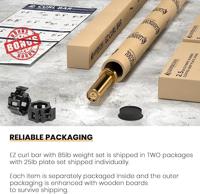 - Reliable Packaging & Warranty: The whole set is shipped in two tough packages with inside each item separately packaged and EZ curl bar is double packaged with sturdy tube and thick cardboard box. The outer packaging is enhanced with wooden boards to survive shipping. We offer lifetime warranty on our EZ curl bar and one-year warranty on the weight plates.