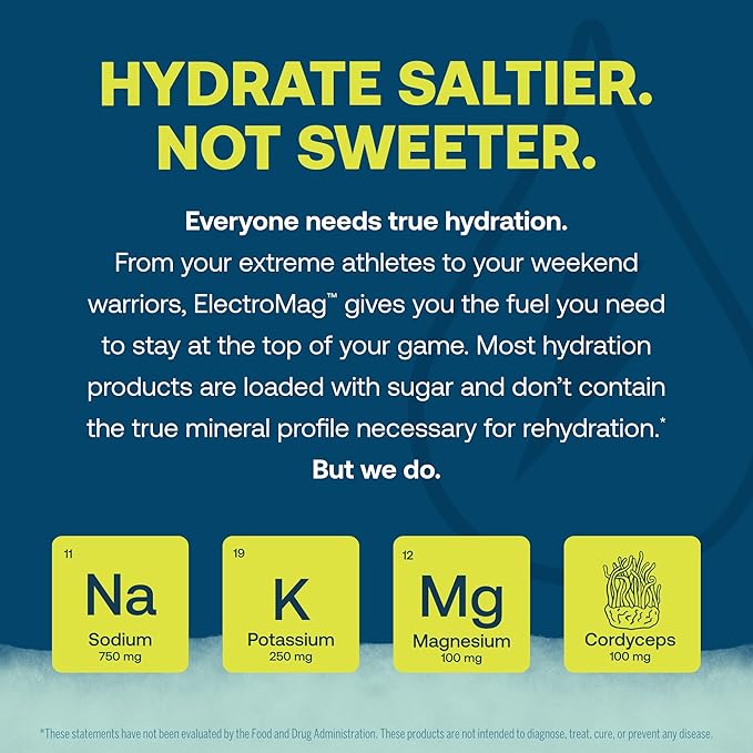 - TRUE DIFFERENCE - ElectroMag is crafted with intention using carefully sourced ingredients. Contains 750 mg sodium, 1390 mg chloride, 250 mg potassium & 100 mg magnesium for essential minerals; 100 mg fruiting body cordyceps mushroom for endurance.