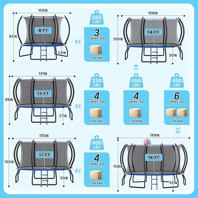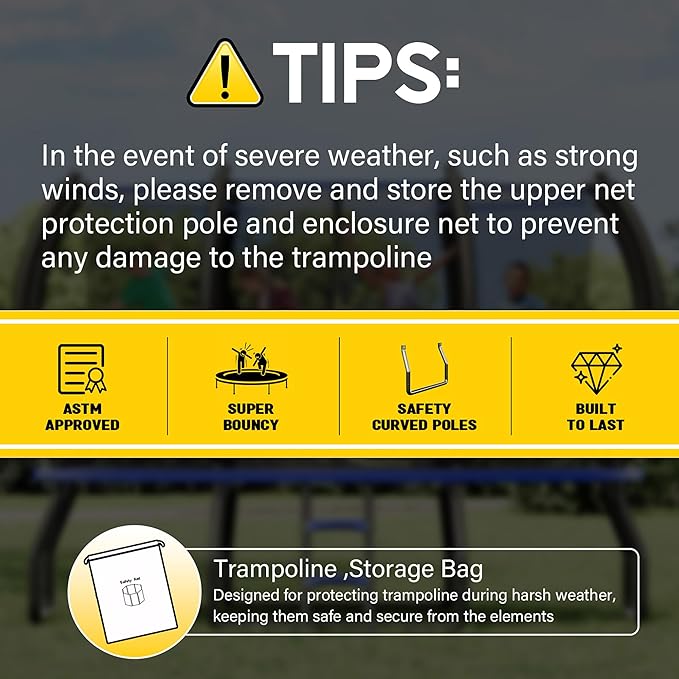- Your Kid's Joy and Security – Our Top Priority: Designed with your child's safety in mind, our trampolines feature curved leg tubes and heavy-duty galvanized steel, ensuring a smoother, more balanced bounce. Safety-first design, meeting ASTM F381-16 global standards.