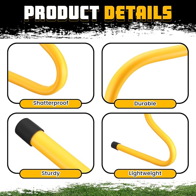 - Enhanced Visibility with Bright Color: the speed hurdles and marker cones come in a vibrant yellow color, ensuring high visibility during training sessions; This bright color allows you to easily spot the hurdles and marker cones, enhancing safety and accuracy as you navigate through the course