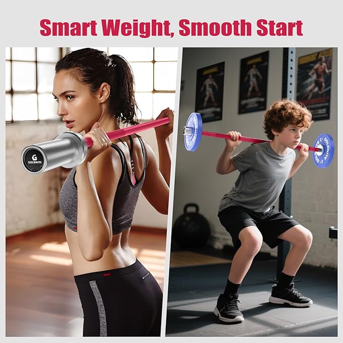 - Beginner-Friendly Multi-Scenario Versatility: From bedroom yoga spaces to garage gyms, GOLDNITE 4ft compact mini barbell bar adapts to cross-training, youth fitness programs, women's strength circuits, and travel workouts. Includes various vibrant colors (blue/pink/red) to match personal style, with sturdy metal to withstand regular use and maintain performance over time