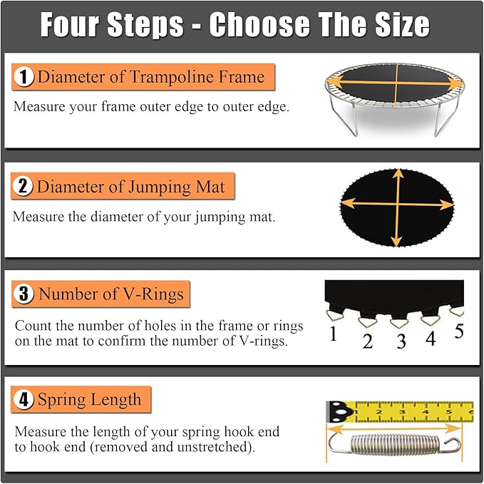 - How to Measure: Please check your trampoline specifications before placing your order (confirm your trampoline frame size, diameter of trampoline mat, number of V-rings, length of spring) and then select the most appropriate size. If the specifications are correct, our mat is the right trampoline for you. If the installation does not work, please check the installation steps. When installing a trampoline jumping mat, strictly follow the installation procedure.