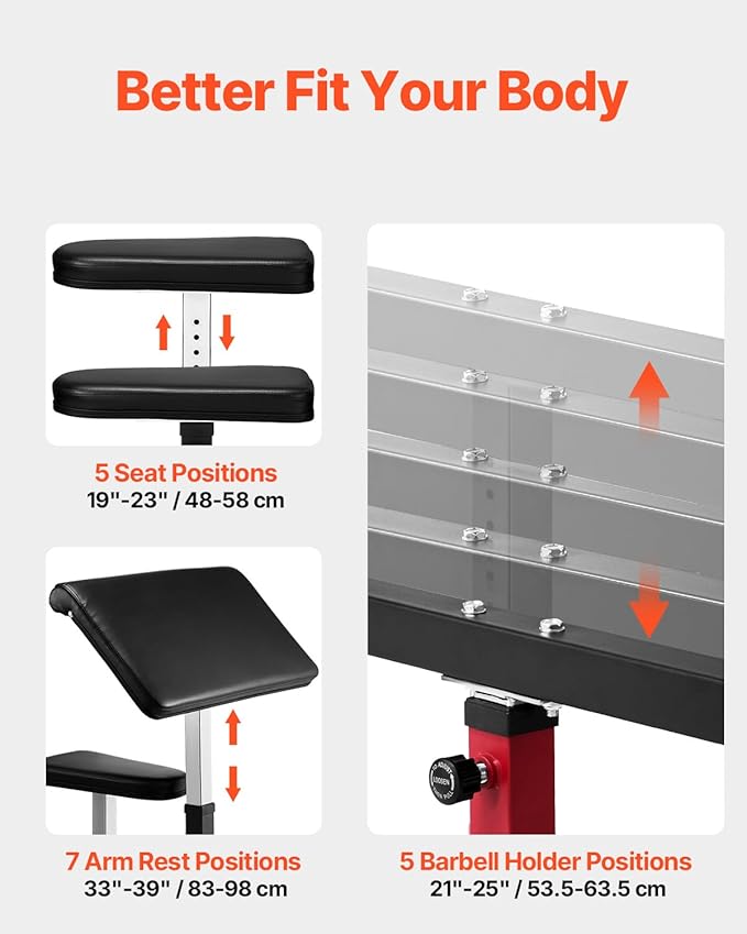 - Customized Comfort & Fit: Adjustable to match your body! This bicep curl machine features 5 seat positions, 5 barbell holder positions, and 7 arm rest positions for a tailored workout experience