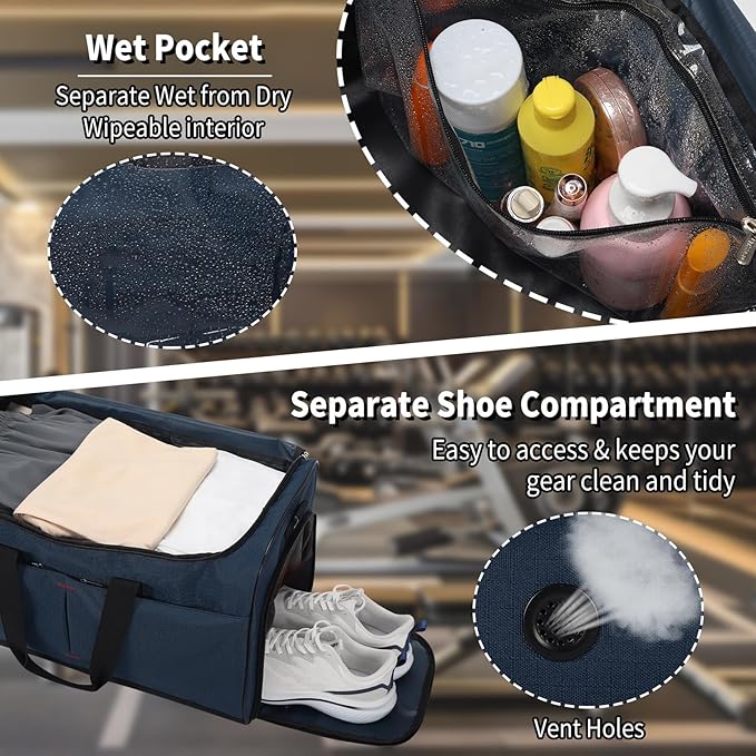 - SHOE COMPARTMENT: This gym duffle bag is designed with a large shoe compartment, perfect for putting your shoes and dirty clothes in after your workout. Two vents help to circulate air inside the bag