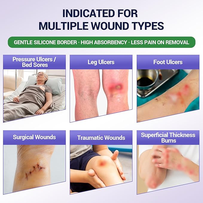 - Comfort & Versatile Protection: Soft and flexible, conforms to body contours. Suitable for moderate to heavily exuding wounds, such as surgical wounds, venous leg ulcers, 1st & 2nd degree burns, diabetic foot, skin tear, donor sites and more