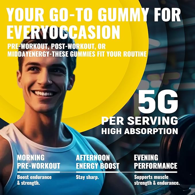 - [ Key Benefits]: Our Creatine monohydrate gummies are an easy way to consume, 3 gummies per serving, you can take it at any time, any place. It improved muscle strength, muscle recovery, improve endurance and energy boost. Suitable for a variety of users, and enjoyable taste.