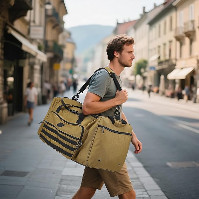 - Tactical Duffel Bag with Big Capacity: Our large weekender travel bag has a size of 32 x 15 x 16 inches and with capacity of 125 liters. With multiple compartments including a ventilated shoe compartment, a side pocket, two front zippered pockets, a inner pocket, and one card slot for organized packing during travel or sports activities.