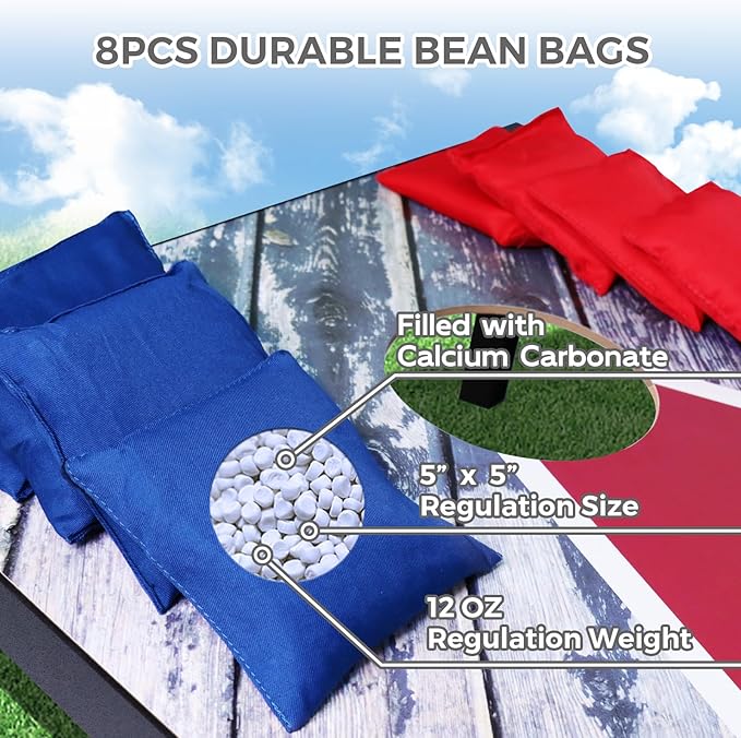 - ☑️【Cornhole Game Set 】 Full cornhole set includes 2 regulation size 3x2ft cornhole boards for authentic gameplay, 8 bean bags for cornhole and 1 carry case. We also have an extra zippered tote bag you can put your cornhole set in to avoid getting dirty, durable double needle canvas corn hole beans bags includes 4 red and 4 blue, standard 5 x 5 inches, perfect for gaming.