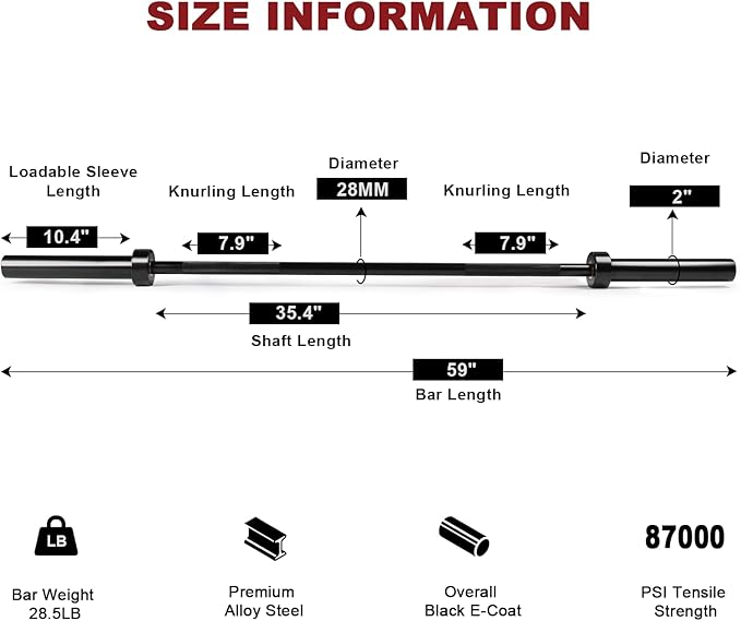 - Take a Comfortable and Firm Grip on this Solid Bar: Made of superior seamless steel, it can reach up to the weight capacity of 500LBS. Medium-depth diamond knurling with specially trimmed top offers enough gripping power while delivering comfortable grip feel. 28mm diameter shaft is easy to hold and one knurl mark at either side helps to place your hands at correct positions.