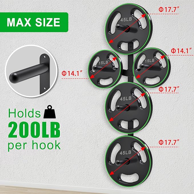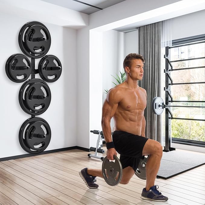 - "Space-Saving Wall-Mounted System: Optimize your home gym layout with our compact wall weight plate holder. The professional-grade design securely stores plates and equipment vertically, freeing floor space while maintaining easy access to your fitness gear"