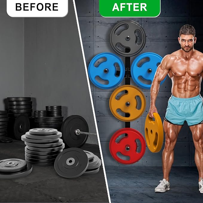 - "Noise-Reducing Protection: Equipped with rubberized pads and flake-resistant finish, our wall-mounted weight plate holder safeguards Olympic plates from scratches, dents, and workout noise"